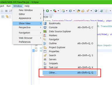 1) eclipse 상단 메뉴의 window – show View – Other 클릭